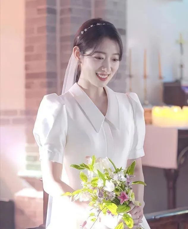 朴信惠拍摄了多组婚纱照,这款婚纱采用了薄纱面料,看起来柔软舒适,很贴合人体肌肤。面料本身就具备了弹性,不会给予身材上的压迫感。薄纱织物的表层还融入了雕花的设计,使得整个穿搭风格更加的浪漫端庄。朴信惠在头上别着一个绿色的饰品,成功点缀了整个穿搭风格,使其得到了一定的升华。