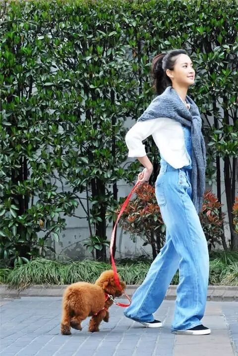 双子座的张歆艺在穿衣上也非常多变,不过不同场合的拿捏还是很到位的,这身遛狗穿搭,加上牵着的小泰迪,少女感爆棚!白衬衣+浅色牛仔背带裤青春气息浓厚,扎个清爽马尾辫出街吧!