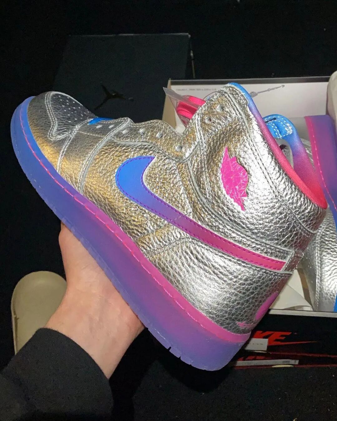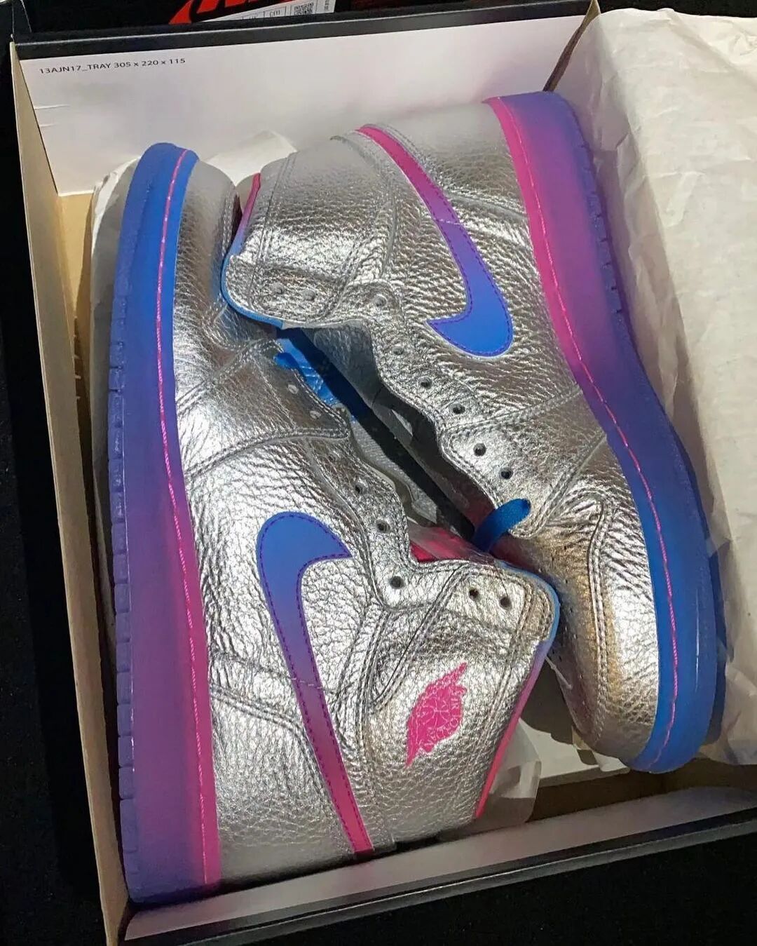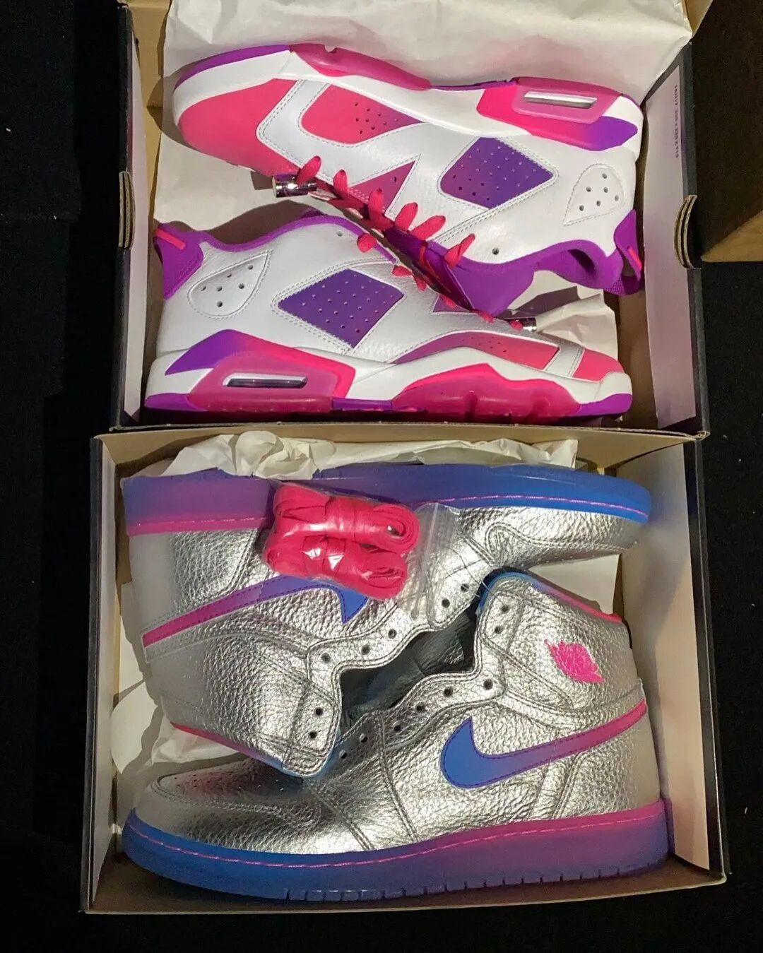 整双鞋通体采用亮银配色,中底与Swoosh与AJ6的色调保持一致,从霓虹紫渐变到粉红色。