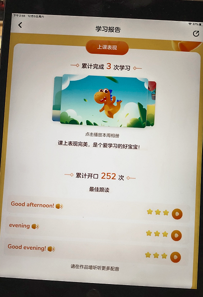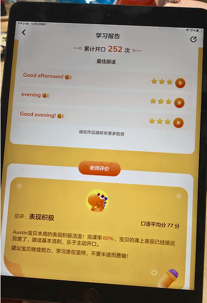 里面记录了孩子开口次数、最佳跟读、老师评价