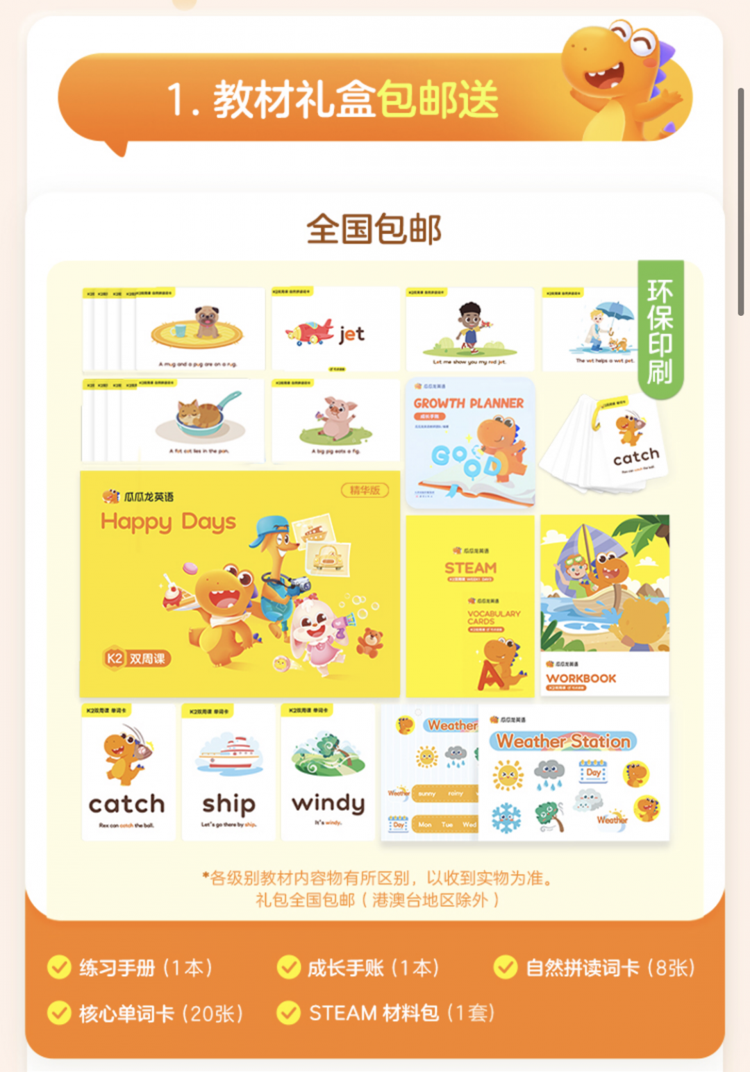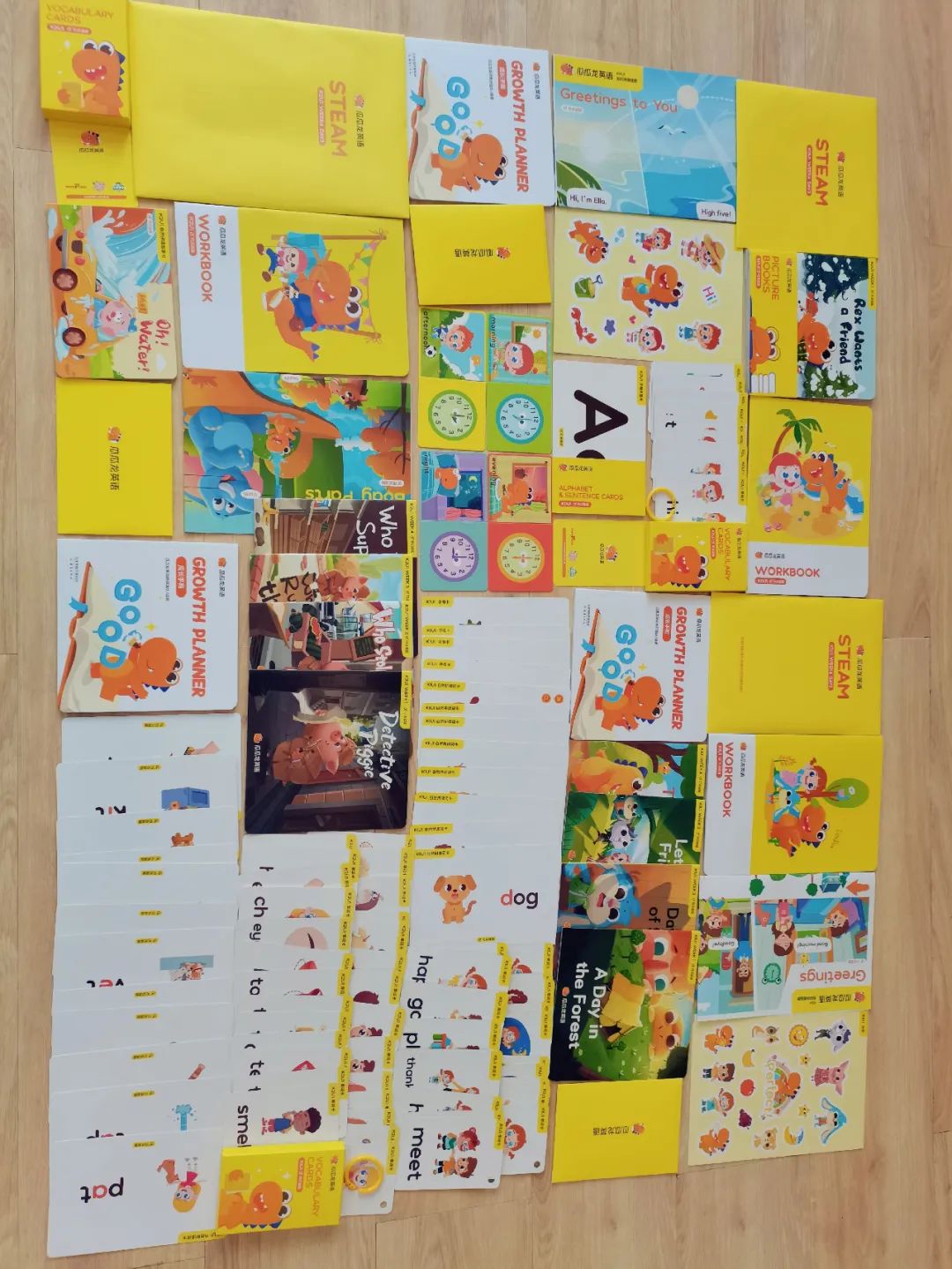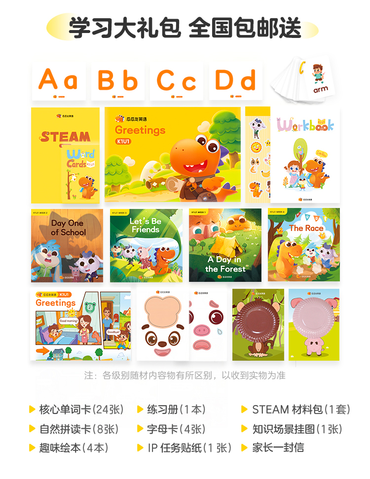1本练习手册+1本成长手账+8张自然拼读词卡+20张核心单词卡+1套STEAM材料包。