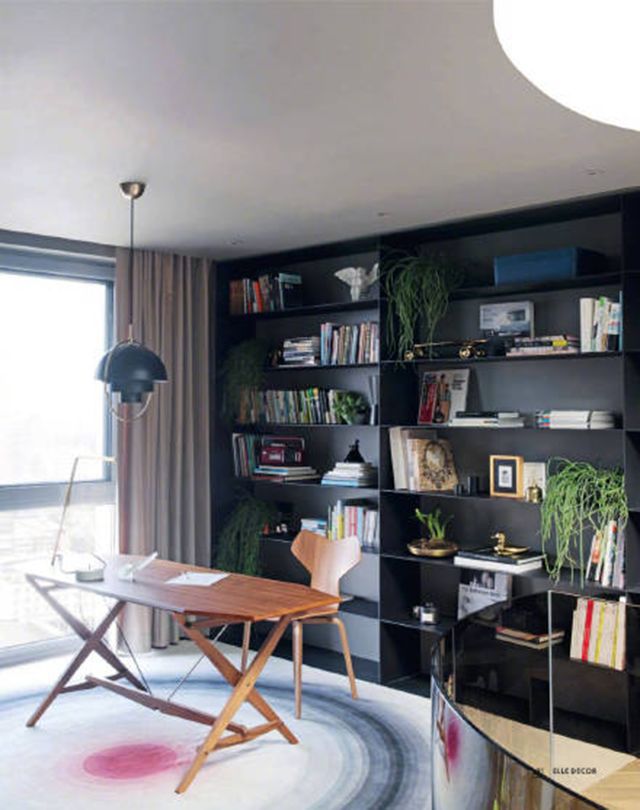 天花板下面悬挂着Gubi黑色球形吊灯,