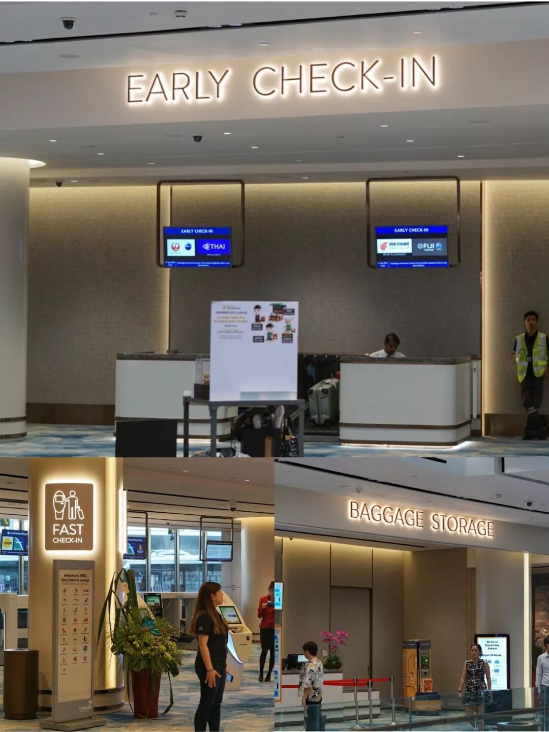 如果你是准备出国,到了星耀樟宜不要着急开始逛,控制住自己。先到1楼找提前办理登记和行李寄存的地方,先办完登机你才能安心的逛吃逛吃,但是一定要记住登机时间,感觉有人会逛到误机。
