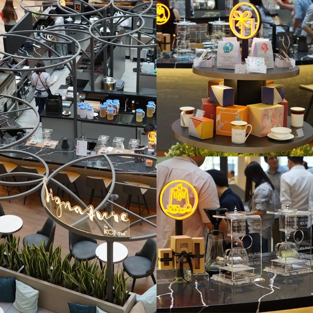 从楼上往下看,可以看到一家有很多有趣圆圈的cafe,这是新加坡有名珍珠奶茶品牌KOI的升级版,Signature by KOI。在这里,你除了能喝到珍珠奶茶之外,还能喝到升级款式的茶饮,可以搭配马卡龙等点心。