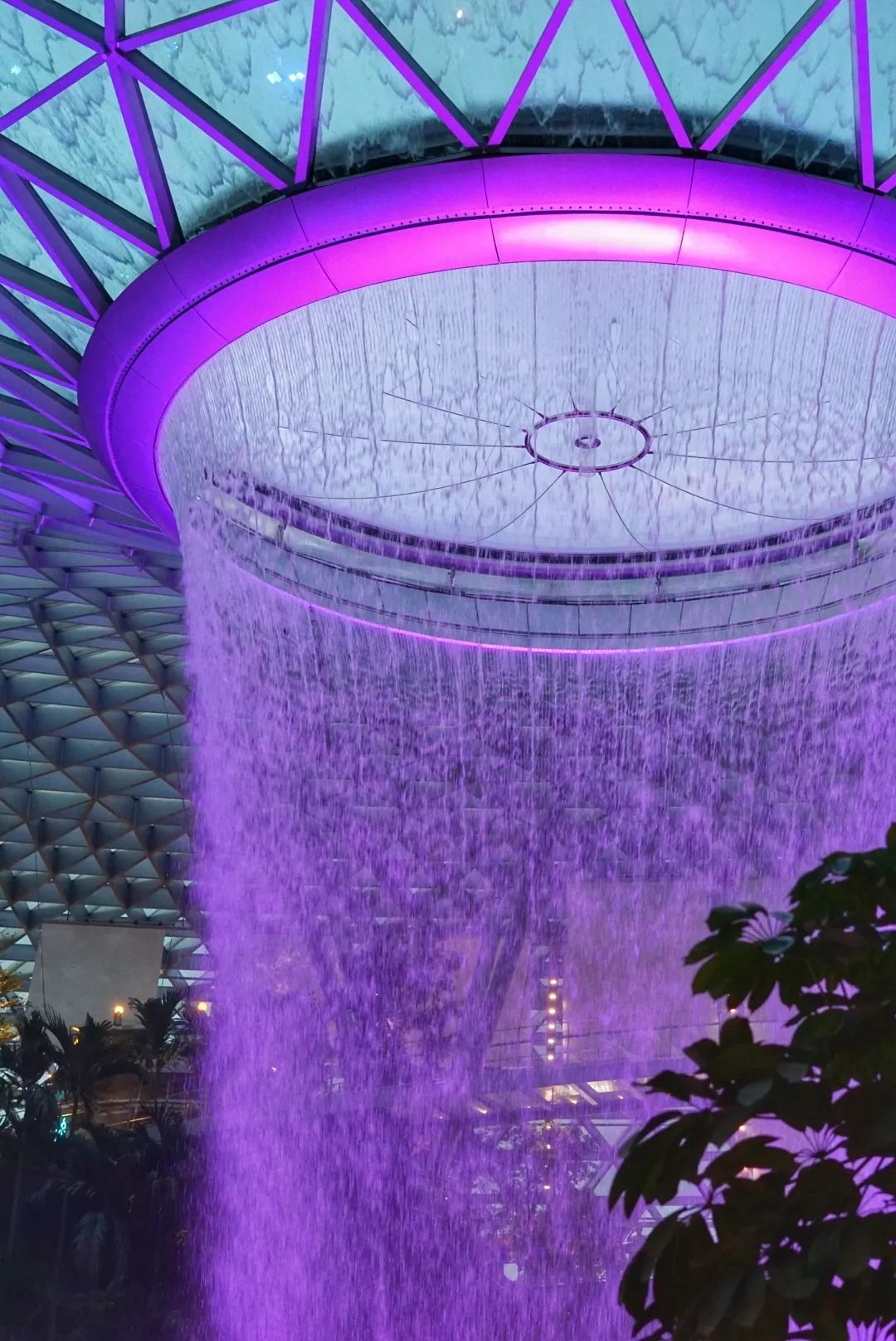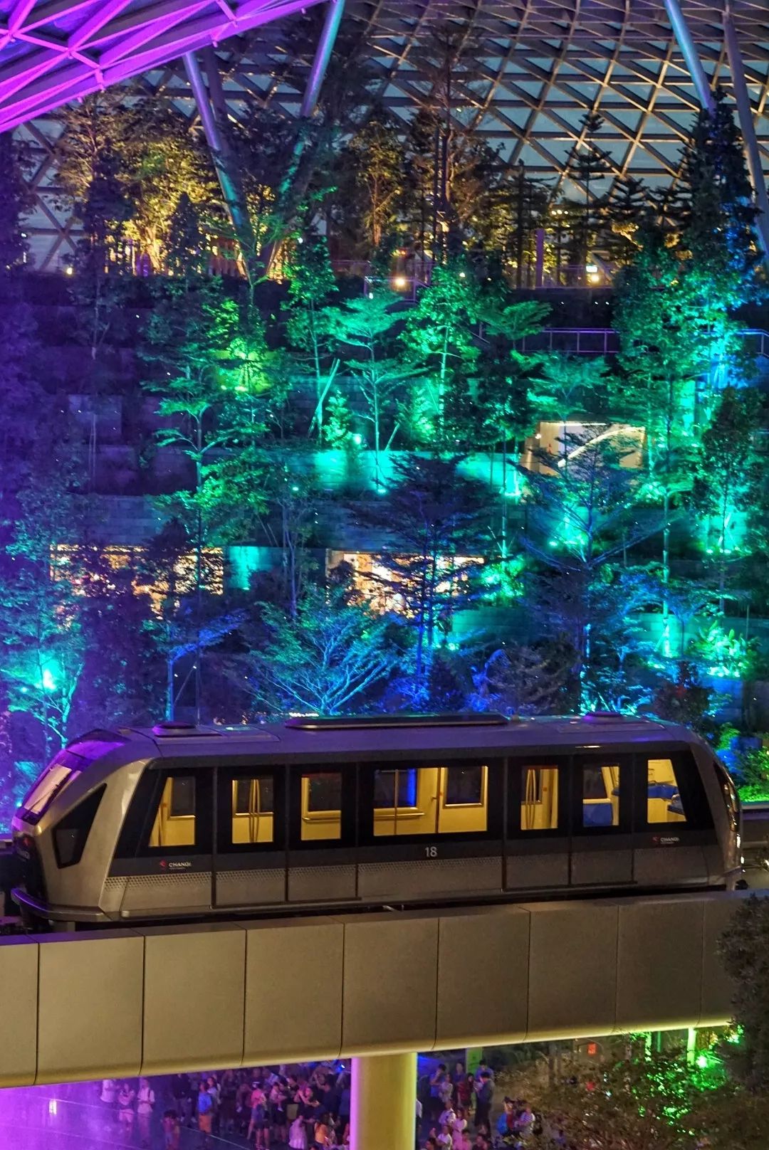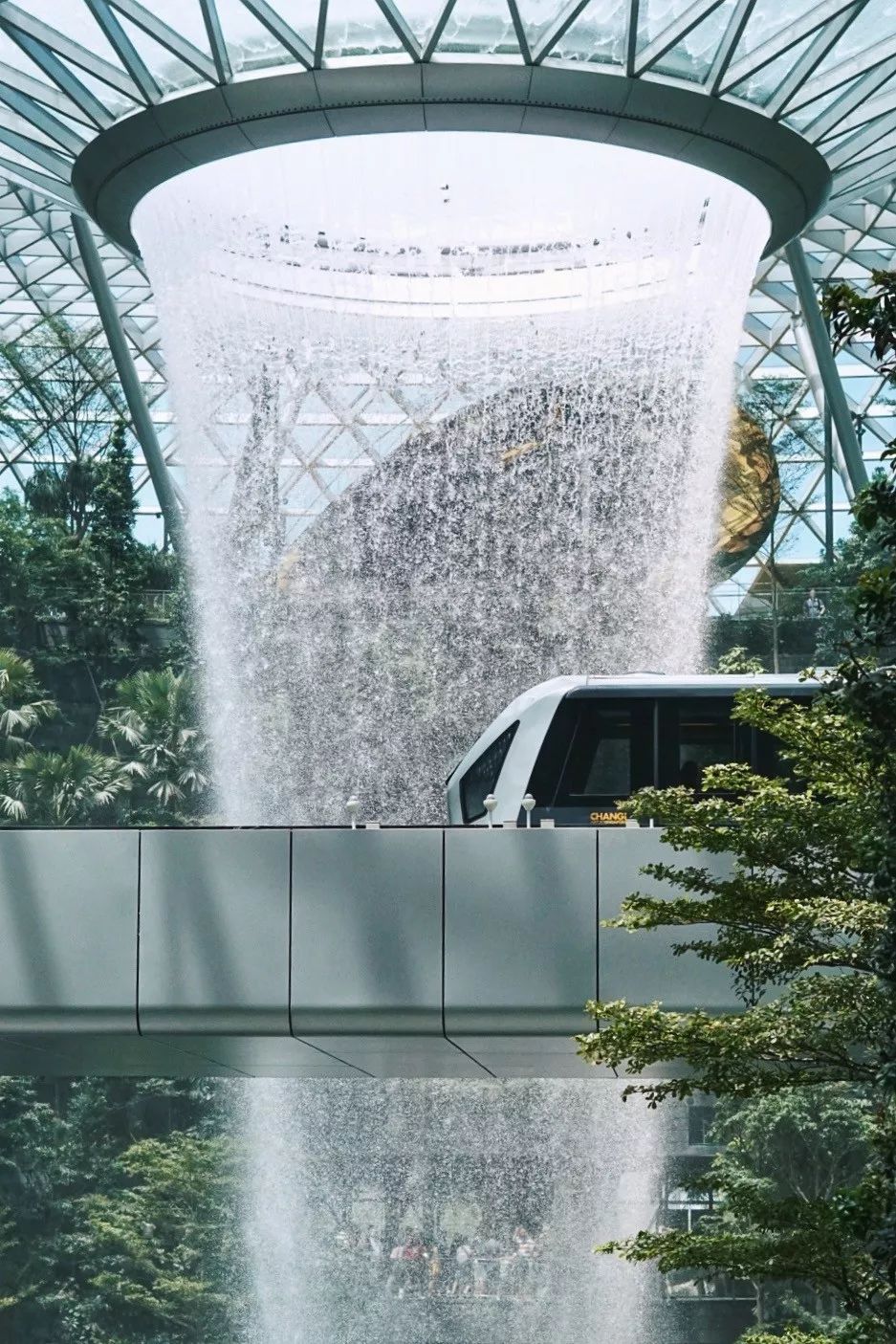很多人是为了这个40米高的室内瀑布而来星耀樟宜,它是世界上最大的室内瀑布,从5楼一直延伸到地下2层。瀑布被森林包围着,轻轨车在中间穿梭,远看真的有仙境的感觉。