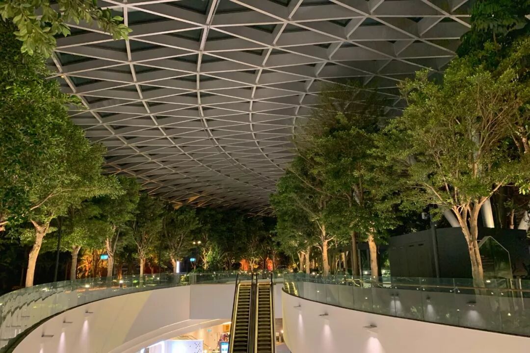 椭圆形的星耀樟宜就像了一个被咬了一口的甜甜圈,共7层,总面积达到13万7千平方米。用了超过9000片玻璃,约1万8000根钢梁;种了超过2000棵树,10万颗灌木,拥有超过120个品种的植物,花园国家这个称号绝对不是浪得虚名。