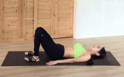 接着是臀部的训练:仰卧,双腿曲起,双手平放地面,臀大肌慢慢收紧