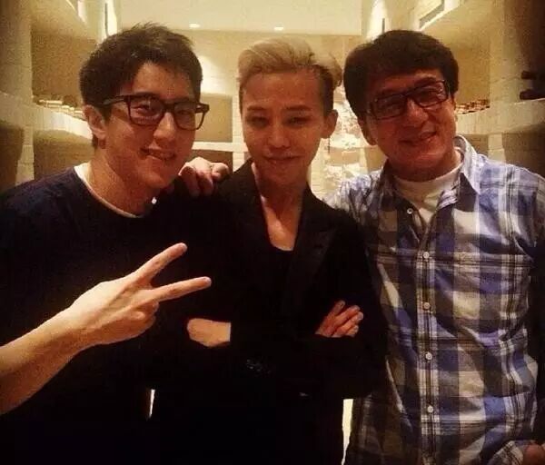 成龙大哥和儿子房祖名还有韩国男团BIGBANG权志龙的合影,这张合影是GD日前助阵国际巨星成龙在杭州举办的慈善演唱会,演唱会结束的庆功宴上三人亲密合影。