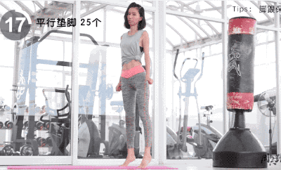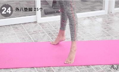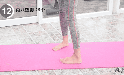 两腿分开与肩同宽,两脚平行向前做垫脚尖动作25次,肩膀放松,腹部收紧。