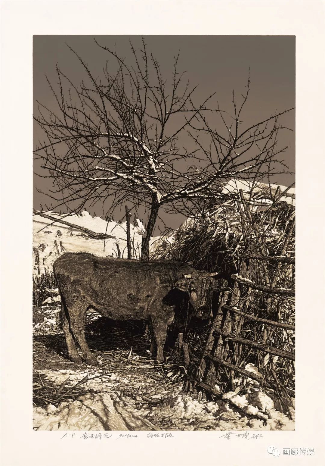 是的,在看到袁庆禄和季世成老师的版画作品时,我是震撼的,袁庆禄老师对生活执着,关注人性,他的作品是那样纯洁、可爱且富有诗性,给人愉悦感;季世成老师则以安宁、静谧的画境,将人们带入现实版的童话世界。这也是他剥离浮华万象,转而聚焦乡村生活的情感回归,他以静态的心智,揭示人们精神境界的真善美。当然,还有众多老师们作品都深深打动了我……。