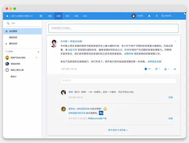 你可以在这里向同事们分享你的工作、观点、知识,可以用最少的时间知晓公司的大事小情。