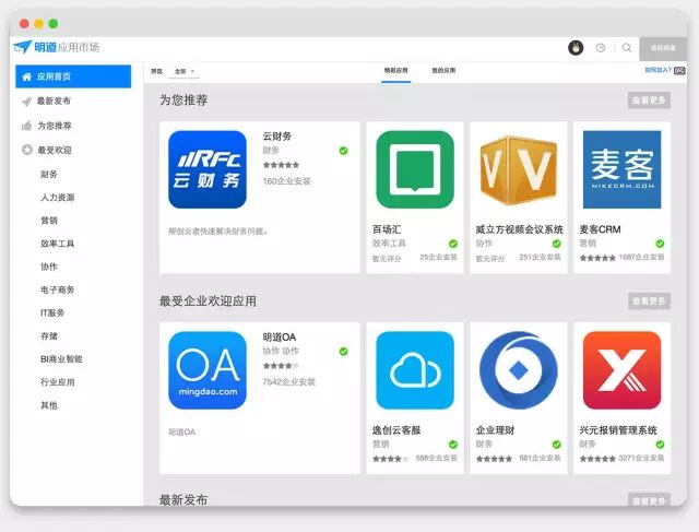 至今我们有接近百家国内主流企业级应用入驻明道应用市场,覆盖财务、CRM、HR、项目管理等10大类别。
