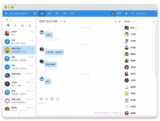 除了支持文字、语音、图片等常规消息外,明道消息更支持任务、日程、文档、动态、投票等数据的传输。