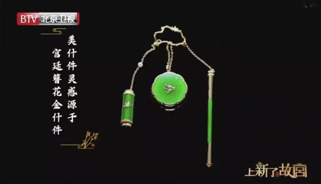 知名珠宝设计师钟华在新品开发员的灵感助力下,创作出首期文创新品——“美什件”,采用“金镶玉”、“失蜡法”、“錾花法”等传统工艺,集倦勤斋中的江南元素、通景画的紫藤雀鸟、金丝楠木仿斑竹的竹形、双面绣上寓意吉祥如意的云纹于一身,融入细节于毫厘之间,凸显节目品质。