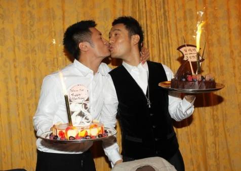 2012年12月11日,北京,电影《血滴子》北京发布会。余文乐与导演刘伟强出席,现场曝光一张余文乐在剧组庆生时的照片,他居然与黄晓明玩起了“男男吻”,真是“基”情四射。