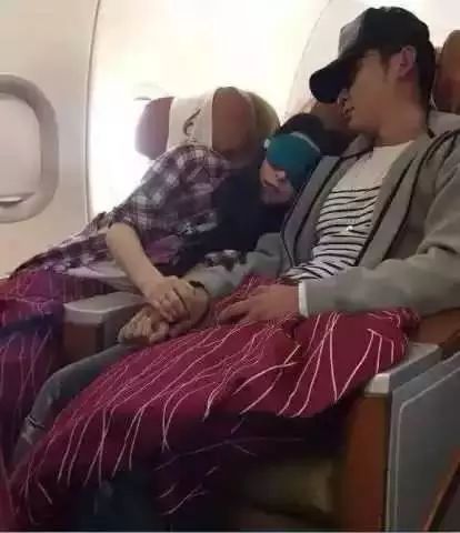 两人在飞机上两人熟睡相互依偎,双手紧握,甜蜜羡煞旁人。