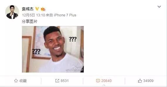 呃,有网友表示真的是莫名地心疼袁成杰,原本很温馨的一件小事,竟就这样成了变成了各粉圈吐槽大会......后面事情越闹越大之后,袁成杰还接着发了一条黑人问号脸的微博,底下网友的评论也是亮点不断~哈哈!(美美娱乐微信号:fcwm520)