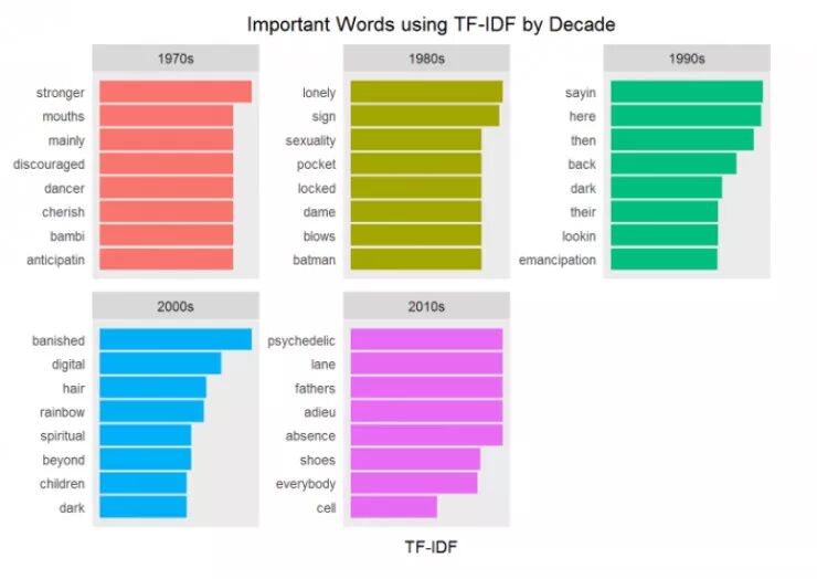 使用 TF-IDF 为观察潜在的重要词汇提供一种不同的视角。当然,解释是完全主观性的。注意到其中的模式了吗?