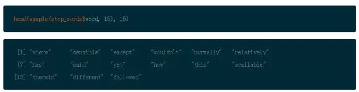 使用 sample() 展示一个这些停止单词的随机列表,使用 head() 限制在 15 个单词。