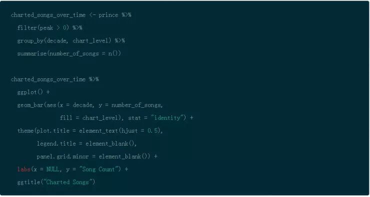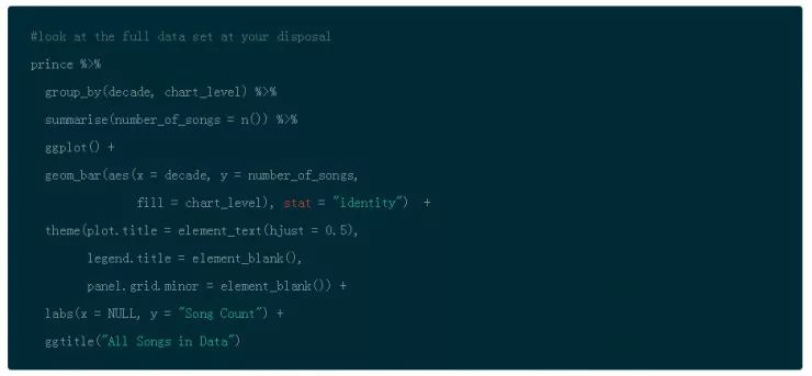 通过使用 dplyr 的 filter(),group_by() 以及 summarise() 函数,你能够按照 decade 来分组,然后计算出歌曲的数量。函数 n() 是多个聚合函数之一,也是对于在分组数据上使用 summarise() 有用的。然后使用 ggplot() 和 geom_bar() 创建条形图然后将分类填充到条形图中。