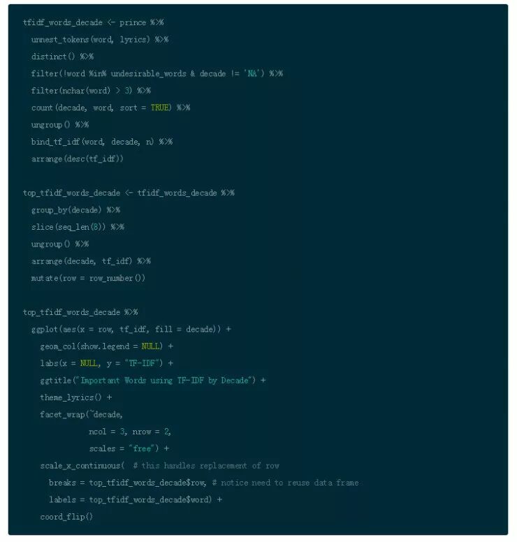 现在如你所见,对于最最常见的单词,IDF and TF-IDF 都是 0.(更科学地说,IDF 的表现形式是自然对数 ln(1),所以那些词汇的 IDF 以及 TF-IDF 的值是 0.)把你的结果作为参数传递给 arrange() 然后以降序的方式展示 tf-idf。通过增加这些步骤,你会以一种不同的视角观察 Prince 的歌词。