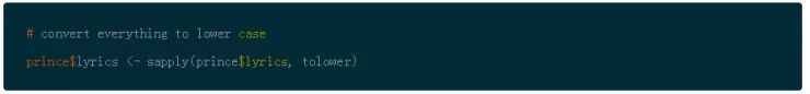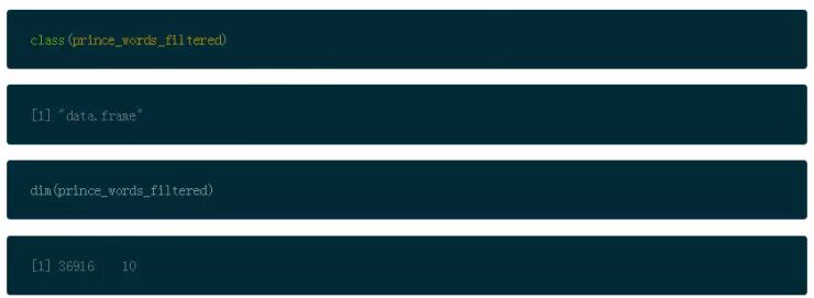 在文本挖掘中调整数据的另一个普遍的步骤是词干,或者叫拆分单词为它们的词根含义。这是可以在以后讨论的话题,现在,看一下 Prince 的数据框架。