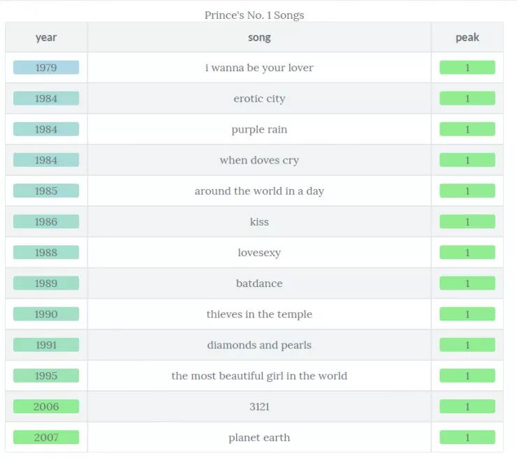 对于那些 Prince 狂热的粉丝来说,下面是一个快速浏览排行榜第一的歌曲(请注意,你可以用来自于 knitr 包的 kable() 和来自于 kableExtra 包的 kable_styling() 以及来自于 formattable 包的 color_tile() 来创建一个更规范的 HTML 输出)