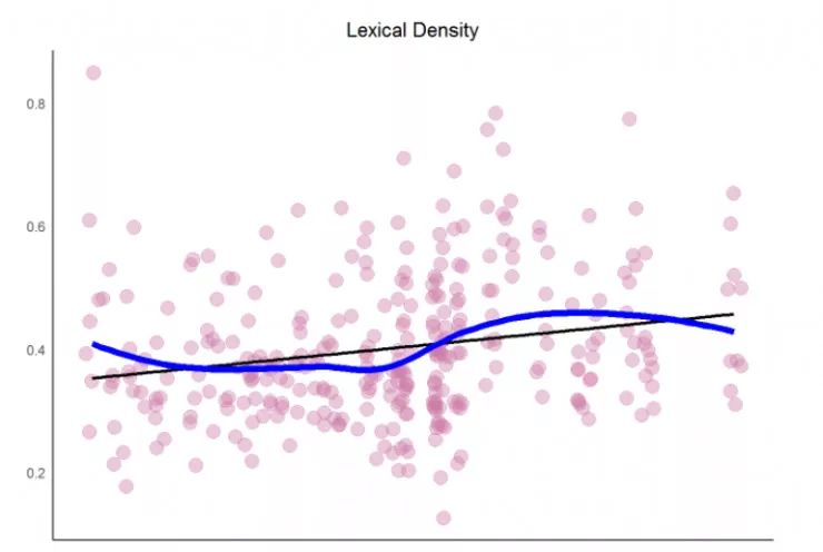 这说明什么呢?过去的数十年间,Prince 的歌词多样性具有一点轻微向上的趋势。这和打榜成功有多少相关呢?很难说,画出密度图和打榜历史再做更近一步的分析吧!