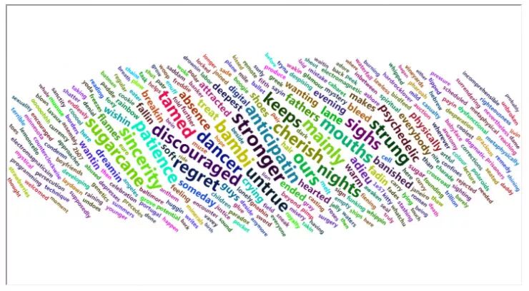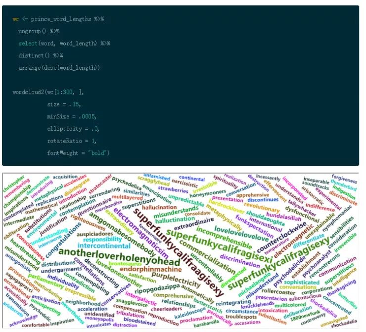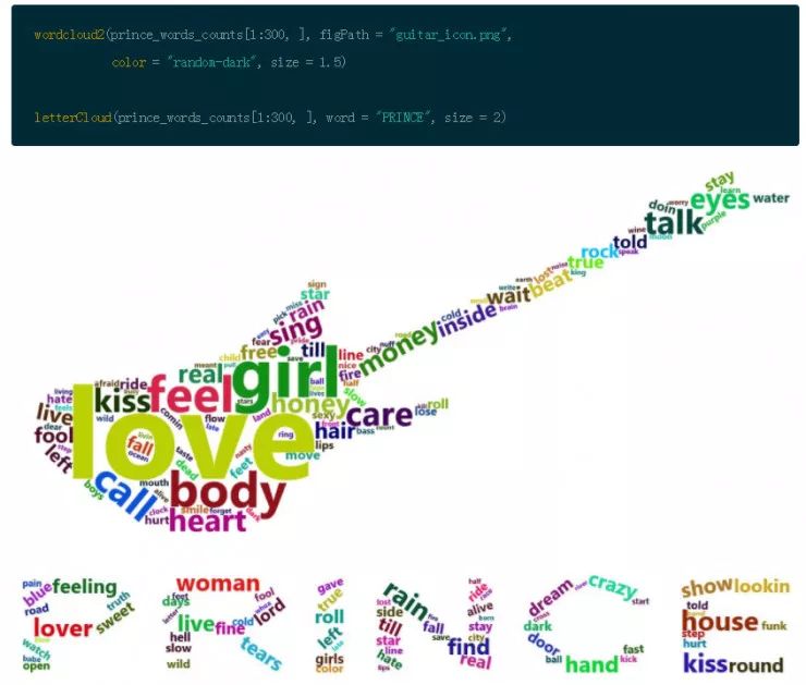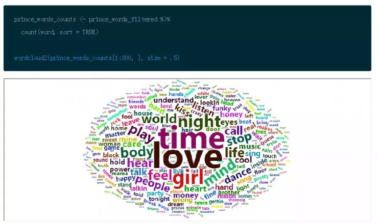 这个方法的词云图以全新的视角显 Prince 中的歌词的重要词汇,事情变的越来越有趣。
