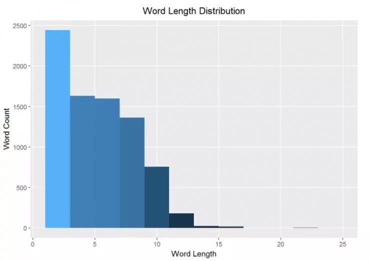 对歌曲作者来说,词汇长度是一个有趣的话题。词汇越长,越难押韵和形成一种模式。下面的词汇长度的直方图展示正如你所期待的,仅有少数词汇的长度是非常长的。