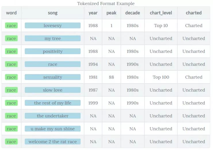 整洁文本:每行都有一个令牌的表。在本例中,令牌即一个单词(或者是在第二部分讨论的 n-gram)。标记化是一个将歌词拆分为令牌的过程。本教程将用 tidytext 的 unnest_tokens() 函数来完成。详细信息,请查阅 tidytext 文档。