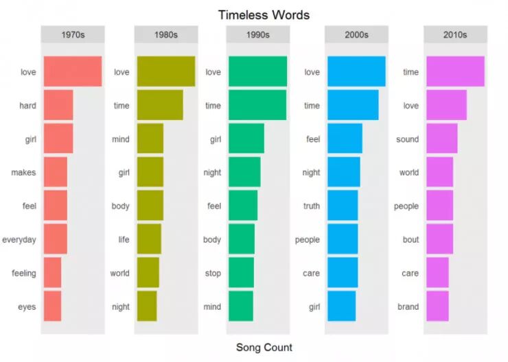 显而易见:爱,时间和女孩是历久弥新的词汇。但是识别流行词汇到底多容易呢?一个世纪就会轮换流行词汇是否为事实?能否简单认为上述的词汇在歌曲中是高度重复的呢?词频是否是识别歌曲主题的依据呢?这种分析歌词的方法是否适用于其它文本挖掘的任务呢,例如分析州政府的演讲?