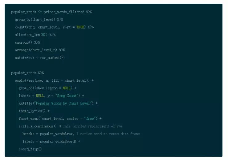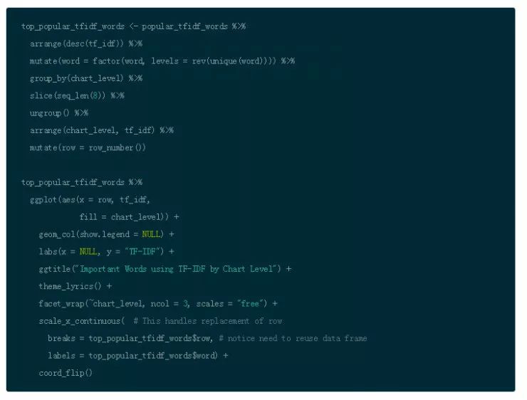 注意到下图代码中使用 slice(seq_len(n)) 的作用是为了获得 chart_level 不同类别的前几名。它的作用和 top_n() 是不同的,并且如果你在图形中使用刻面的话,这是更加方便的选择。(需要谨记这类技巧有不同方法)你可以使用 row_number() 函数来确保在图形中你可以按照正确顺序呈现单词)。ggplot() 默认设置是按照字母排序,并且实际操作中排序要优先于画图。