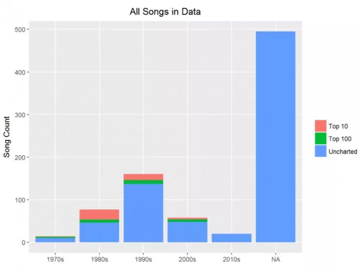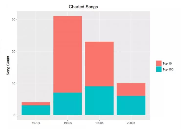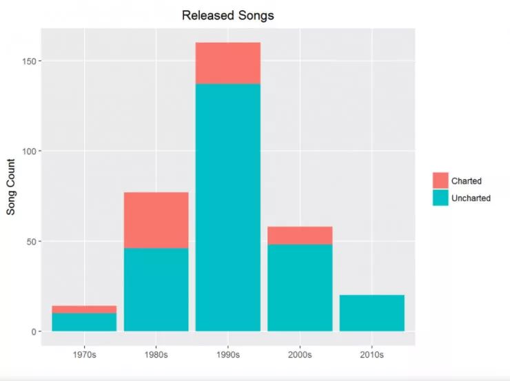 注意到所有 Prince 的上排行表的歌曲,大部分都是前 10 名。但是更有趣的是在他创作新歌最多产的十年是 90 年代,但是更多上排行表的是在 80 年代。为什么会发生这样的事儿?请在看文本挖掘部分的时候记住这个问题。