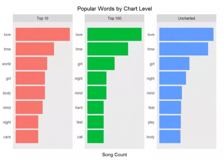 截至目前我们已经观察所有歌曲中的流行词汇。如果你根据打榜名次分组后会发生什么?在上榜歌曲和未上榜歌曲中是否存在更流行的词汇?这些被认为是社会中流行的词汇。