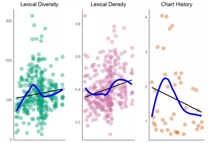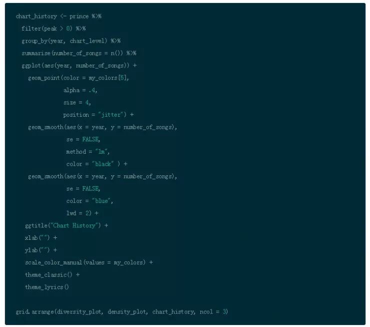 你可以观察到过去几年间,Prince 的词汇多样性和密度呈轻微上升趋势。怎样比较这个趋势和所有流行歌曲的关系呢?有研究显示打榜歌曲的词汇多样性和密度呈下降趋势,暗示重复性有所提升(例如:词汇更多,说得更少)。这个趋势和 Prince 的歌曲不同。另一个研究证明所有流行歌曲,多样性(独特词汇)在过去年间呈现上升趋势,这和 Prince 歌曲正相关。这可能是因为过去榜单排名试图丰富类型多样性。类型是数据的关键部分,但是这个变量在我们的数据集并不存在。这是否是因为榜单历史对流行歌曲的影响力日益衰微,对 R&B/Rap 的影响力日益加深?