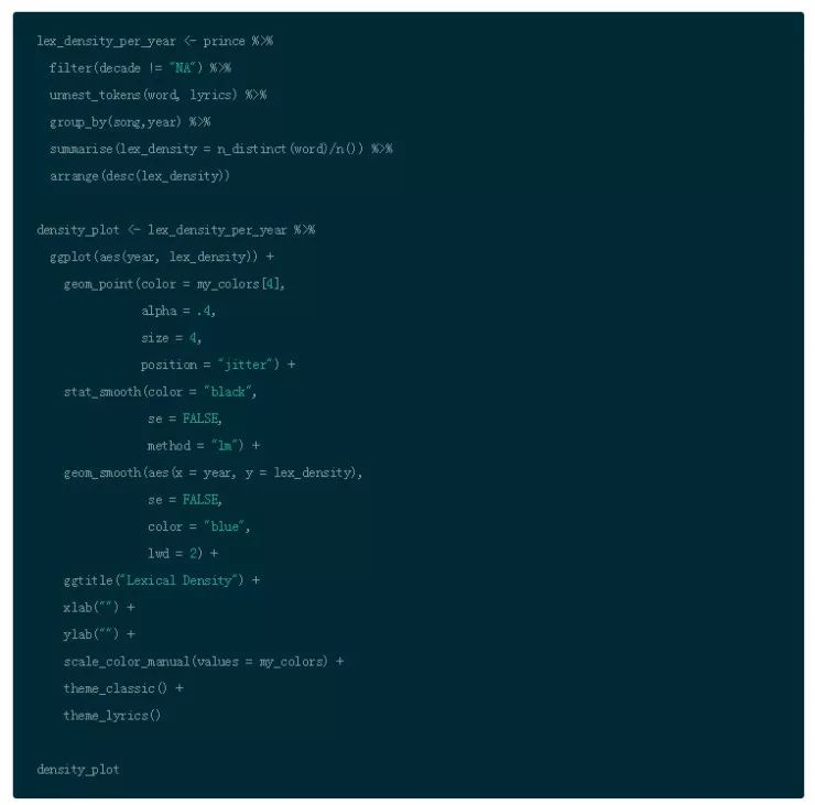 观察过去几年间 Prince 的词汇密度。考虑密度的话,最好保留所有词,包括停词。所以从原始的数据集和未经过滤的词汇开始。根据歌曲和年份分组,用 n_distinct() 和 n() 计算密度,把结果用 geom_smooth() 传给 ggplot() 。此外用 stat_smooth() 的 lm 模型做一个线性平滑模型。