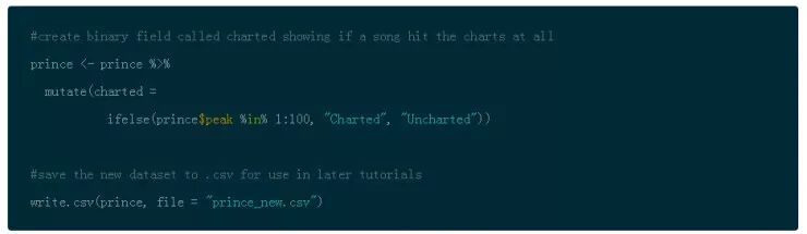 另外,创建一个叫做 charted 的二值项表明一首歌是否入围 Billboard 榜单。使用 write.csv() 来保存为了以后的教程中使用。