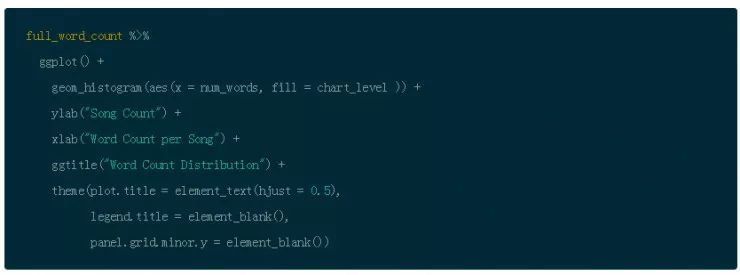 为了测试 Prince 歌词的格式,可以根据歌曲名称和公告牌是否上榜分组,建立直方图来展示词频的分布。利用源 Prince 歌词得到一个真实的词频计数。再一次利用 group_by() 和 summarise() 函数计数。随后使用 dplyr 和 arrange() 排序。首先,看一下词频最高的歌曲,再使用 ggplot() 的直方图展示。