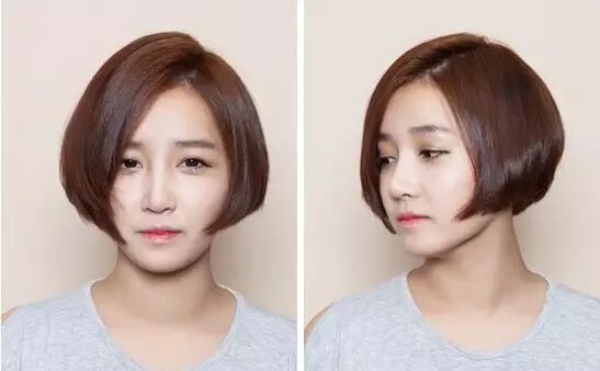 把bobo头修剪成后面短前面长的形状可以让脸看上去小一些,将头发偏分,两侧的头发能拉长脸型。类似图上这一款,是很多姑娘模仿的人气发型之一。