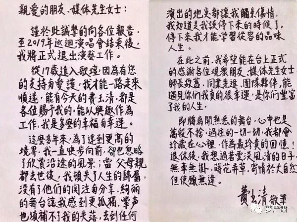 谨于此诚挚的向各位报告,至2019年巡回演唱会结束后,我将正式退出演艺工作。