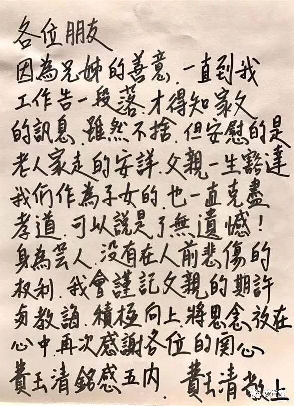 看完告别演唱会之后,我专门去搜了一下2017年9月费玉清父亲去世的消息,才发现那时费玉清也写了一封亲笔信,说因为兄姐善意,直到自己工作告一段落才知道父亲去世,“身为艺人,没有在人前悲伤的权利”。