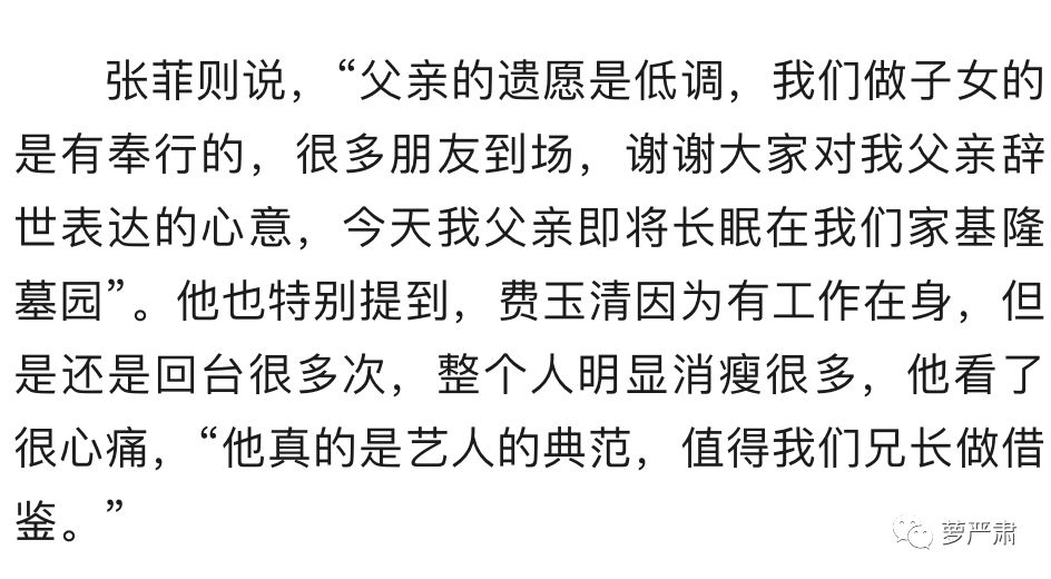 因为坚持履行答应好的工作合约,2017年10月费玉清遗憾缺席了父亲的出殡。