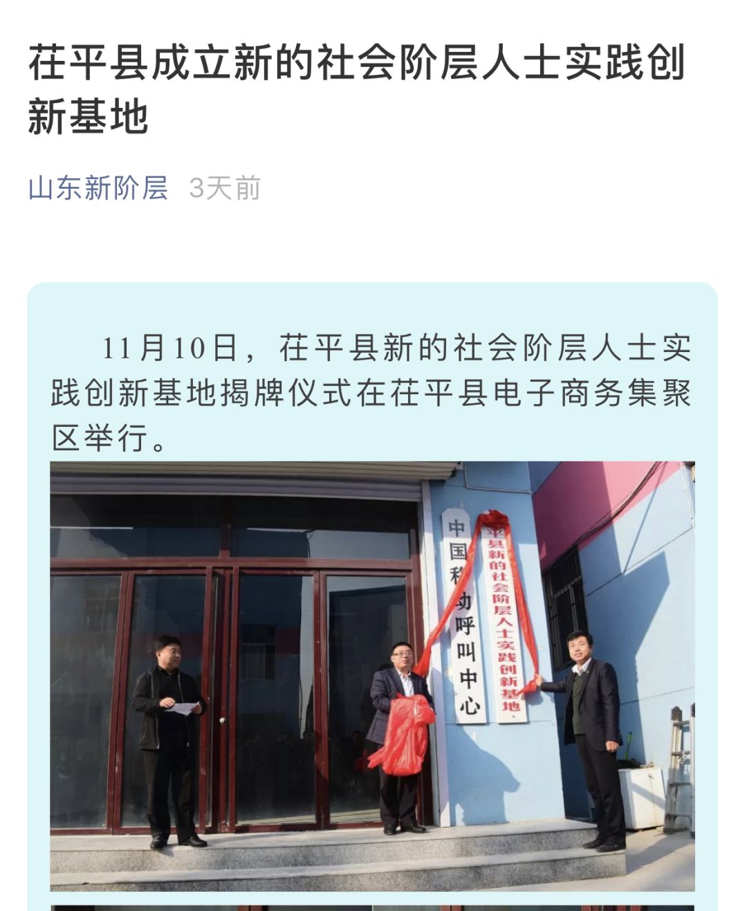 编者按:11月12日,山东省委统战部“山东新阶层”微信公众号刊发《茌平县成立新的社会阶层人士实践创新基地》。