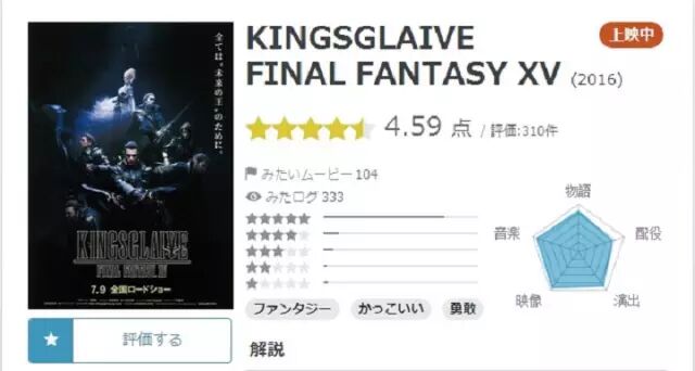 《最终幻想15》已先在日本地区上映了,观众纷纷大呼好看,雅虎电影更是给出4.59的高分,认为这是一部难得的佳作。