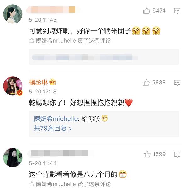 陈妍希幸福感爆炸,还回复了宝宝干妈杨丞琳,一连点赞了好几条夸赞宝宝的评论↓