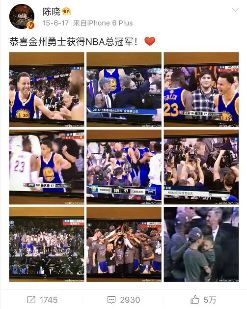 陈晓是个篮球迷,是勇士和库里的迷弟↓