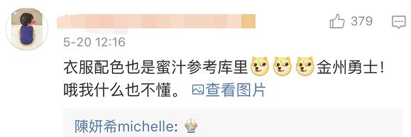 还有网友一眼看穿小细节。小星星穿的衣服和球迷陈晓的NBA主队勇士队服蜜汁相似↓