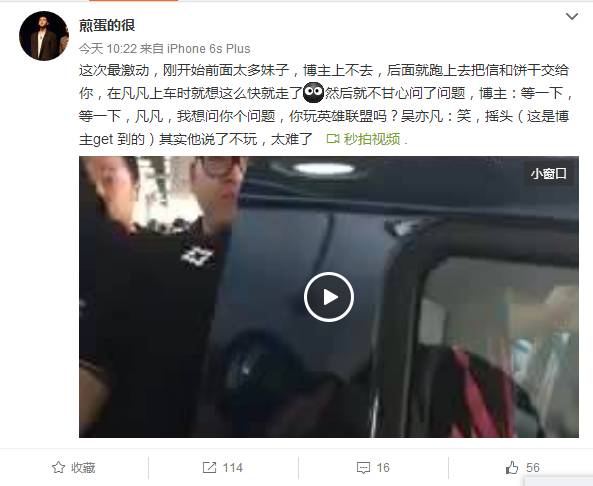 这次最激动,刚开始前面太多妹子,博主上不去,后面就跑上去把信和饼干交给你,在凡凡上车时就想这么快就走了然后就不甘心问了问题,博主:等一下,等一下,凡凡,我想问你个问题,你玩英雄联盟吗?吴亦凡:笑,摇头(这是博主get 到的)其实他说了不玩,太难了 。