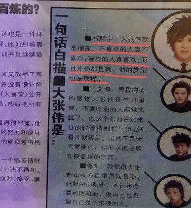 就如前乐队成员石醒宇评价的一样,说大张伟就是榴莲,不喜欢的人真不喜欢,喜欢的人真喜欢,而且外壳都是刺,他的发型也是那样。